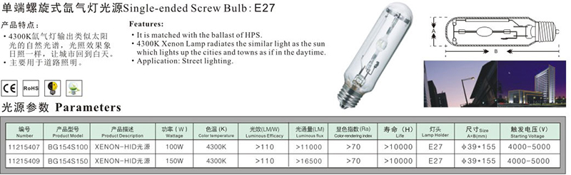单端螺旋式氙气灯光源E27